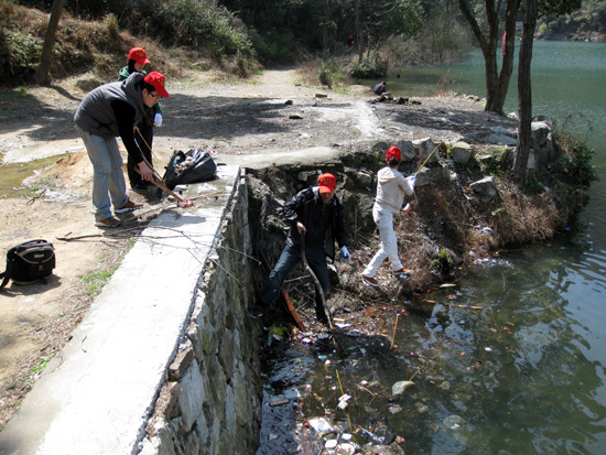 图片:水库边的死角,垃圾特别多,上面的义工拿大树枝把河面的垃圾挑过去,下面的义工一点点 ..