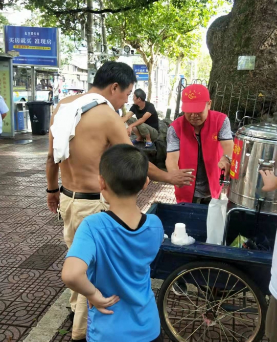 南方夏天的炎热是来自四面八方的,柏油路像铁板一般炙烤着鞋底,湿热的空气像是蒸汽围绕在身边,万里无云的蓝天上太阳像喷火枪一样让人无处可躲。即便是这样的三伏天气,依然有在烈日下来来往往的人们,交警、环卫工人、市政施工人员、志愿者、匆匆而过的行人……无论你是谁,无论你在干什么,若是有个十几秒的空闲,不妨放缓脚步走近些,喝喝我们的“爱心凉茶”。